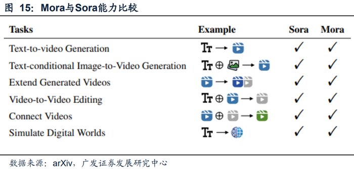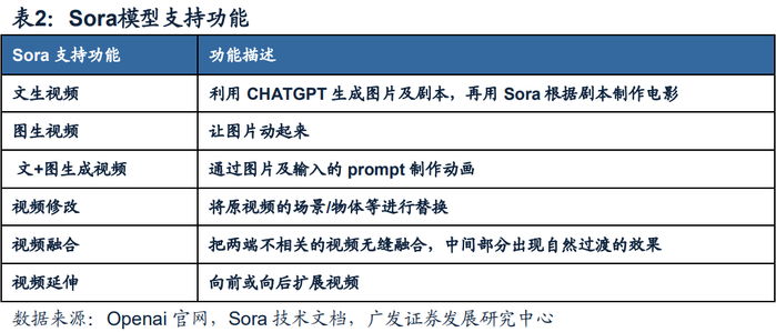 视频生成具备较高门槛,模型能力是短期竞争差异所在。在视频生成方面,我们认为行业整体处于技术驱动时点,具备优质多模态技术的大模型仍然较为稀缺。OpenAI旗下Sora具备优秀的模型效果惊艳。在模型场景上,支持文生视频、图生视频、文+图生成视频、视频修改、视频融合及视频延伸等功能。