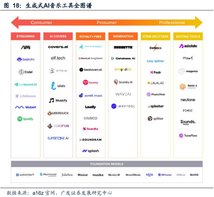 AI音频生成行业作为AIGC技术的重要分支,正处于快速发展的阶段。目前海外AI音乐生成的代表产品有Suno、Mubert、AI Cover&Songs、Soundful、Soundry AI、Splash Music等,产品类型涵盖消费端及专业创作。