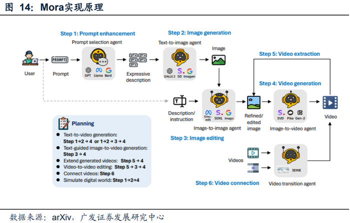 在类似的模型方面,微软研究院发布的Mora论文展示了与Sora接近的呈现效果。根据团队发布的模型方法显示,该模型由5个基本角色组成(1)Prompt选择和生成Prompt selection agent这里面的工具包括GPT、Llama、Bard等(2)形成文生图agent,这里工具包括DELL2、SD、Imagen等;(3)图像到图像的agent实现图像编辑,使用工具包括Emuedit、SDXL、Imagic等;(4)图像到视频生成agent完成视频的生成和拓展,其工具包括SVD、Pika、Gen-2等;(5)最后通过视频到视频agent完成视频的拼接,工具主要是SEINE。通过使用不同的开源模型和agent的组合,使得Mora能很快的完成相关任务。
