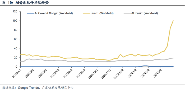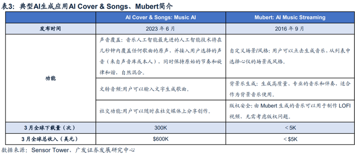 在产品的应用方面,我们预计AI+音乐产品有望在以下三类领域产生较好的应用。一是配乐方面,包括游戏音效、影视配乐、原创短视频的背景音乐等,由于AI工具的高效率和高质量,后续有望进一步加强影视游戏等PGC作品的配乐效果,同时对以UGC为主的短视频,创作门槛的降低也有望使得AI音乐成为短视频重要的创作工具;其二是用于广告营销领域,通过快速创作和多样化的音乐风格,能够满足广告行业对个性化和吸引力音乐的需求;其三则主要是与社交结合,以Suno V3为例,其交互界面和功能设计强调了社交和传播属性,由于声音是人重要的社交载体,优质的音声创作能力为社交提供了良好的破冰缺口,从而使得音乐与社交的结合成为潜在的发展方向。