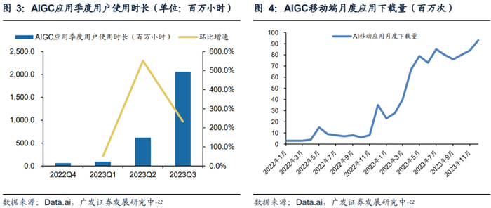 AIGC应用流量持续增长,应用下载量与使用时长增加。以移动端为例,根据Data.ai,生成式人工智能应用于2022年11月起进入高速增长时期,其标志性事件是Chatgpt的推出。ChatGPT于2023年5月与7月相继推出iOS与Google Play的移动版,推动人工智能应用下载量持续提升。Data.ai估计2023年12月AI相关应用下载量达到9300万次,2023全年用户移动端下载总量达到8.1亿次,同比增长652%。