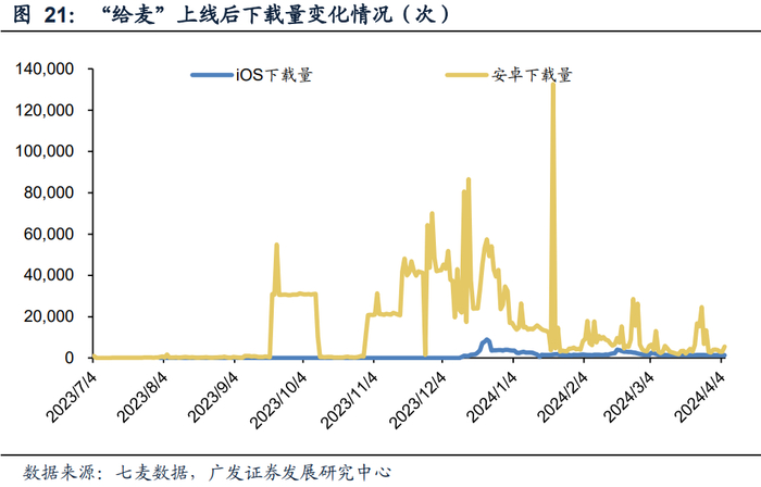 在应用场景方面,我们认为音乐与社交的结合值得关注。在AI+音乐社交方面,盛天网络已于1月上线AIGC+音乐相关APP“给麦”,其APP内主题玩法包括连麦、K歌合唱、AI声音进化、推理社交游戏、语音开黑交友等流行的音乐玩法,针对Z世代强化打造音乐社交型社区环境;其特色玩法在于AI实验室,可以通过音色合成的方式提取用户语音,并生成歌曲,达到虚拟演唱的效果,即歌曲表现如同用户自己唱出来。公司后期计划围绕“给麦APP”构建AI虚拟人生态圈,打造更丰富的应用场景,如AI写歌、AI歌手演唱、AI专辑封面等,不断拓展社交产品边际,优化玩家体验,丰富产品的可玩性。在流量端,据七麦数据,产品上线以来APP端总下载量约为400万次。