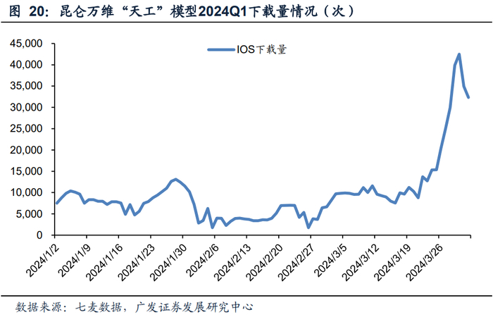 国内模型持续跟进,有望成为率先突破赛道。音乐领域国内模型及应用跟进迅速。2023年4月17日,昆仑万维与奇点智源联合发布的大语言模型“天工”正式发布,据昆仑万维官方微信,“天工”是国内首个对标ChatGPT的双千亿级大语言模型,可满足文案创作、知识问答、代码编程、逻辑推演、数理推算等需求。2023年8月23日,昆仑万维推出国内第一款AI搜索产品“天工AI搜索”。据公司公众号显示,该功能深度融合AI大模型能力,通过人性化、智能化的方式全面提升用户的搜索体验,为用户提供快速、可靠的交互式搜索服务。整体而言,在模型领域,“天工”整体功能迭代迅速。在下载量方面,根据七麦数据,24Q1,“天工”下载量超87万次,近7日日均下载量超3.2万次。