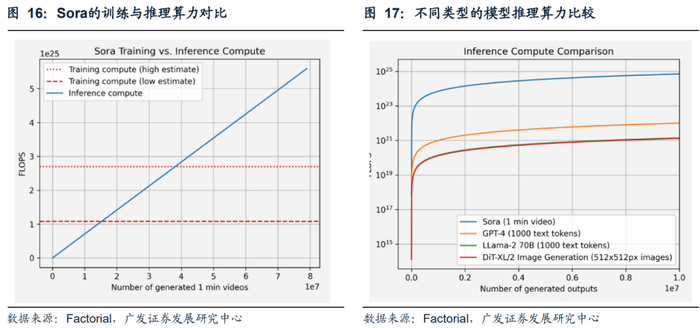 开源及复刻模型跟进,长期竞合还将结合场景。我们预期仅从模型效果来看,开源模型发展速度较快,其他模型与Sora的差距有望缩小。但由于视频生成普遍较高的算力训练成本和数据成本,目前在视频生成领域,技术仍然是较为核心的竞争点。更长期来看,与文本及图片类的模型不同,视频类模型在推理方面仍需要消耗大量算力,从而使得视频内容生成对算力的消耗较文本类、图片类有极大的提升,根据投资机构Factorial估算,随着生成数量的增加,Sora的推理成本预计将高出GPT-4约2-3个数量级(1000 Text Tokens VS 1min Video)。因此优质的内容使用方式和用户付费场景可能是该类模型商业化落地的重要方向。