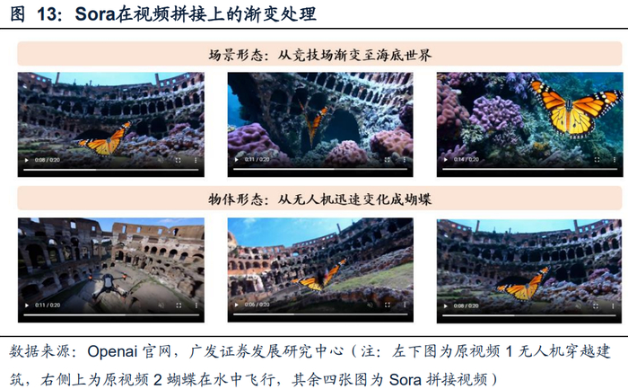 在模型效果方面,以视频拼接为例,Sora在技术文档案例中展示了两个视频,其内容分别为无人机穿越竞技场建筑及蝴蝶在海底世界中飞行,并用Sora将两个视频拼接为一个。在场景方面,随着时间推移,场景由建筑渐变为海底景色并被海底场景逐步替代,而无人机则快速(1秒内)变为蝴蝶。用户在意识到镜头前端视角中心的物体变化时,远端的场景已经完成了替换,形成了较为自然的变化效果。通过不同视频进行拼接,实质上达到了优秀的编辑效果。