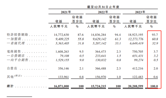 梦金园的收入主要来自于特许经营网络,包括加盟商和省级代理。2023年,公司来自特许经营网络的收入占比达到93.7%。截至2023年末,公司的特许经营网络覆盖1687名加盟商旗下经营的2817家加盟店、七个自营直营区服务中心及17个省级代理。
