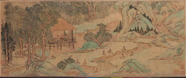 永和九年三月三,王羲之在山阴兰亭,同一众名士以曲水流觞,饮酒作诗,写下天下第一行书。图为记录这场雅集的画作——明代文徵明《兰亭修禊图卷》。