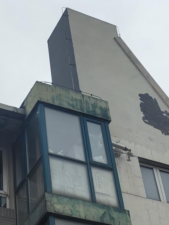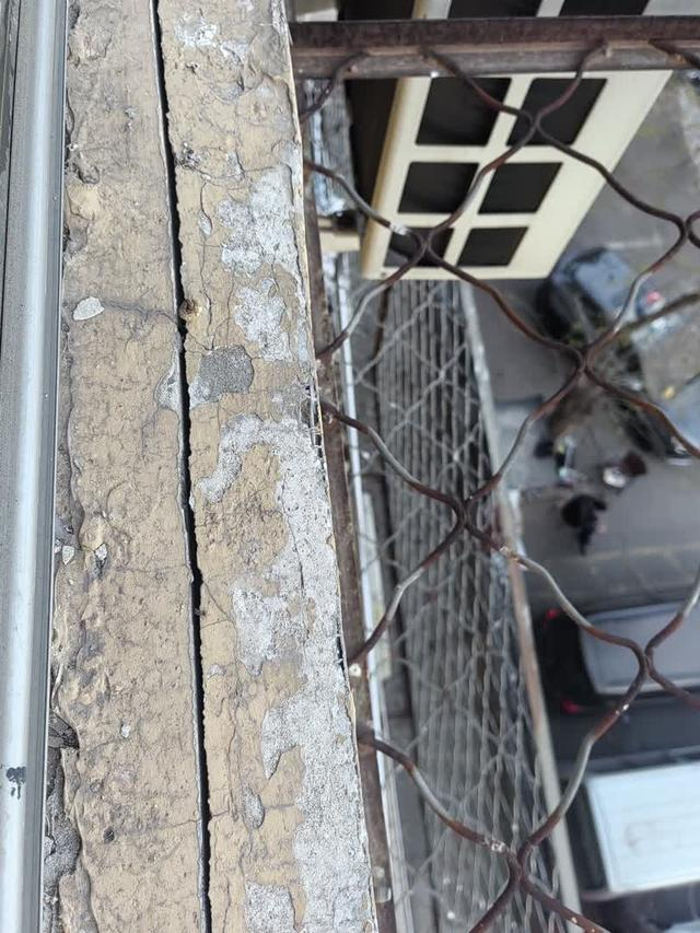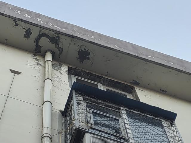 蒲安西里12号楼屋顶屋檐处的破损痕迹