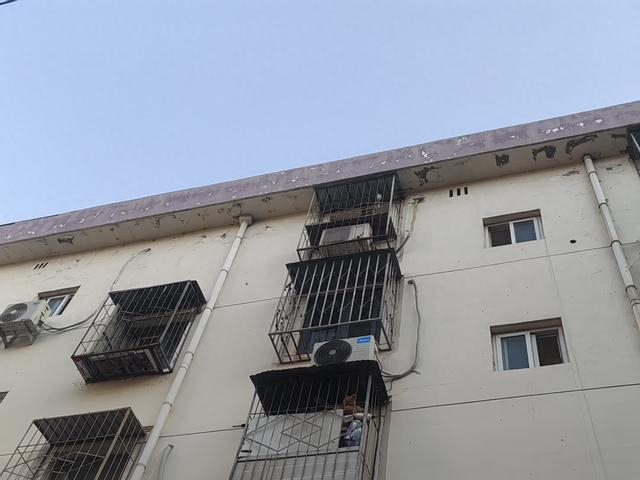 下午时分,蒲安西里12号楼楼下,几位家长和孩子正在玩耍。在该楼栋顶檐上,可看到红色墙皮破损,露出斑斑点点的白色涂料。而在顶檐下方,一块块墙皮或起皱或掉落,露出灰色水泥状墙面。