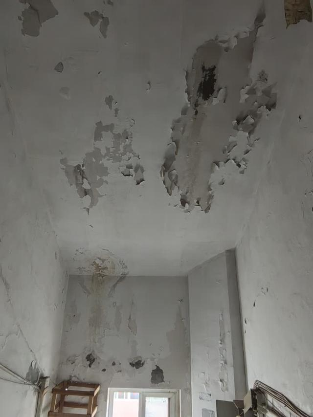 记者在多个单元楼门探访发现,内部墙面也有雨水冲刷的痕迹。尤其在5层楼道的屋顶区域,近乎整个屋顶都有漏雨渗透或冲刷导致的墙皮起皮、破损等情况。