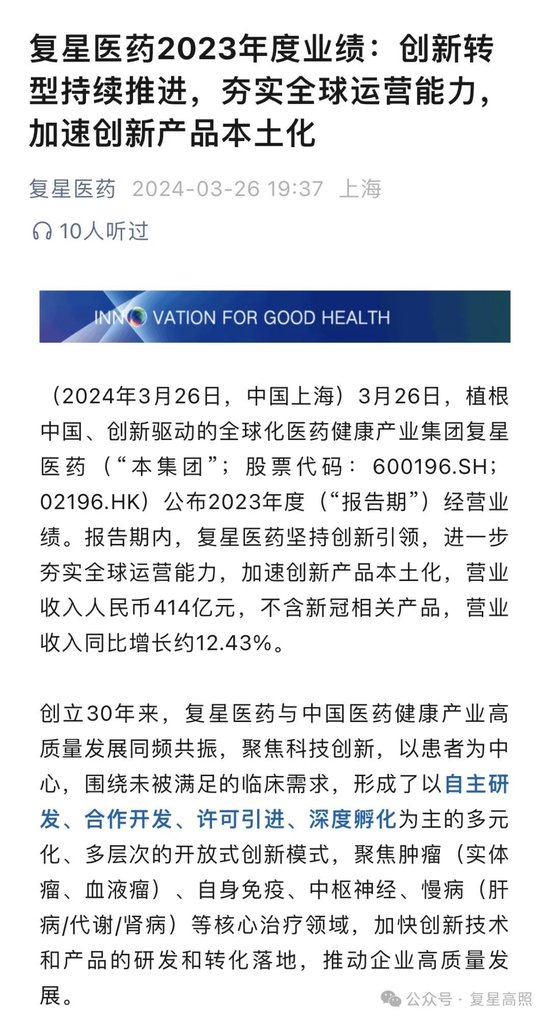 昨天美中互利、复星国际、江苏万邦公众号纷纷转载复星医药公众号关于2023年业绩的帖子。帖子里什么都是增长,什么都是超过,你完全看不出来这家公司营业收入、净利润、扣非净利润、经营利润是下滑的,以为净利润增长36%。