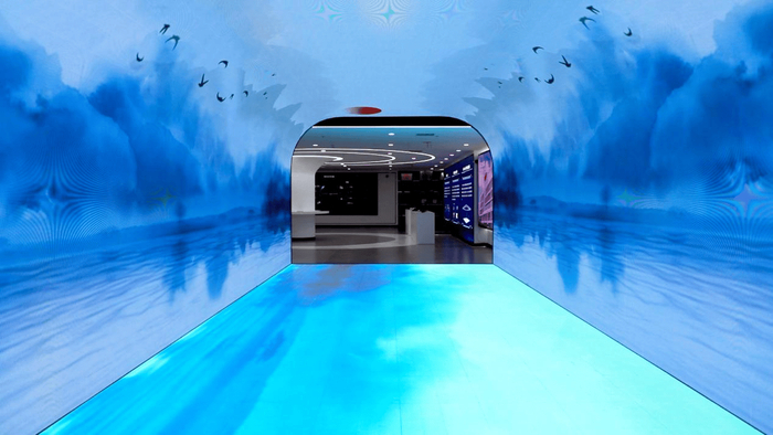 据利亚德集团副总裁、首席营销官(CMO),虚拟动点CEO刘耀东介绍,“时空隧道”由弧形的天顶屏、两侧壁屏以及地面屏共同构成,共同营造出一个令人仿佛置身于风景区的沉浸式场景。值得一提的是,“时空隧道”曾在冬奥会上服务过,为观众带来了震撼的视觉盛宴。