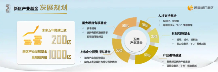 为赋能产业发展,去年5月,湖南湘江新区正式发布了产业基金规划,计划5年出资200亿元,构建起“人才支持基金+科创引导基金+产业引导基金+上市企业投资并购基金+重大项目专项基金”五位一体、覆盖企业全生命周期的产业发展基金体系,通过发挥财政资金的杠杆引导作用,引进国内外知名投资机构,撬动优质社会资本参与,打造千亿规模子基金集群。