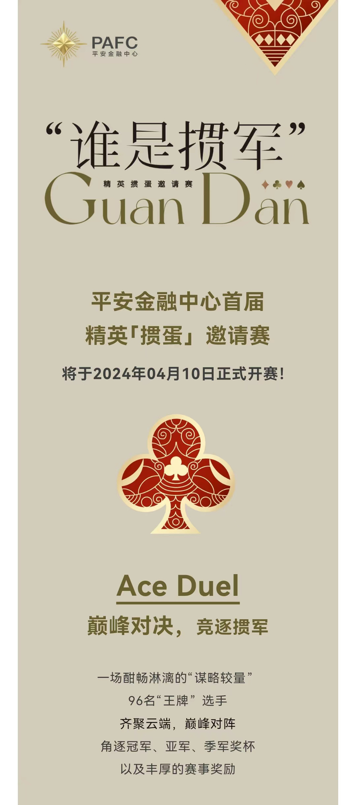 深圳平安金融中心新近在公众号上发布了“谁是掼军”首届精英掼蛋邀请赛,比赛就在4月10日拉开帷幕,有96名选手参加。