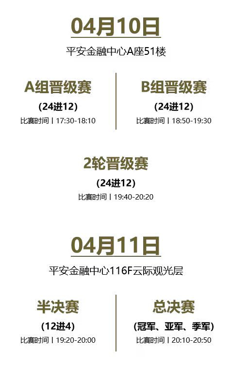 赛制也是有模有样,涵盖2轮晋级赛、1轮半决赛和1轮总决赛。活动海报刚发出,就有多位爱好者表达参与兴趣。而且此次平安金融中心的比赛规模,颇有进一步扩大之势。