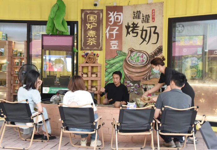 创意园更像是田园风光下一处复古集装箱式的文艺“小院”。这里主打“狗仔豆”文化,怡然自得的氛围中,围炉煮狗仔豆奶茶,叹一口狗仔豆冰啡,品一碗狗仔豆黑米芝麻糊和酸辣可口的凉拌狗仔豆,“治愈”二字浮上心头。