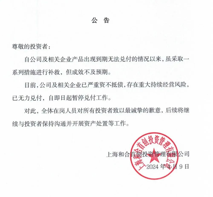 4月9日,上海和合首创投资管理有限公司(以下简称“和合首创”)发布致投资者的公告,其中称“自公司及相关企业产品出现到期无法兑付的情况以来,虽采取一系列措施进行补救,但成效不及预期。目前,公司及相关企业已严重资不抵债,存在重大持续经营风险已无力兑付,自即日起暂停兑付工作”。