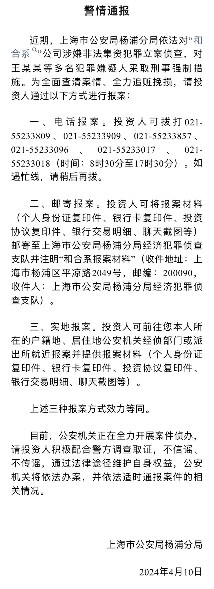 4月10日,上海市公安局杨浦分局发布警情通报称,近期,上海市公安局杨浦分局依法对和合资产管理(上海)有限公司、上海和合首创投资管理有限公司(以下简称和合首创)等“和合系”公司涉嫌非法集资犯罪立案侦查,对王某某、梁某某等多名犯罪嫌疑人依法采取刑事强制措施。