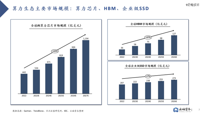 算力生态市场前景广阔,规模持续增长。据Gartner预测,到2027年,全球AI算力芯片市场规模预计将达到1194亿美元,2022年至2027年复合增长率达22%。全球HBM市场规模增长迅速,2026年市场规模预计将达127亿美元,2022年至2026年复合增长率达37%。全球企业级SSD市场规模稳步增长,预计将从2022年的207亿美元增长至2026年的273亿美元。