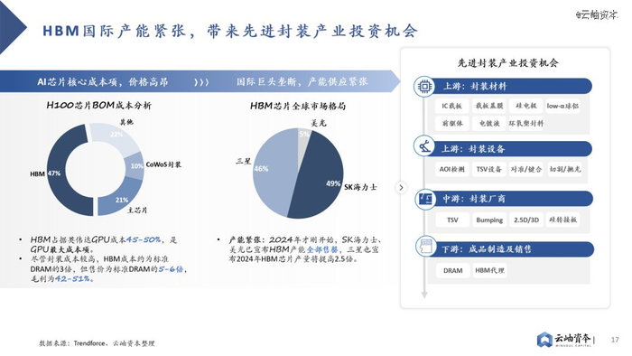 三大巨头垄断背景下HBM成本高昂、产能紧张,带来国内先进封装产业链投资机会。HBM芯片占据AI芯片近半数成本,售价为标准DRAM芯片的5-6倍,毛利高达42%-51%。同时受制于国际三大巨头SK、三星、美光垄断格局,HBM产能紧张,预定周期已达6-12月。先进封装作为HBM制造中附加值最高的环节,发展潜力巨大,存在国产产业链投资机会。