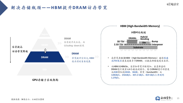 因此,业界主要采取两种路线解决存储瓶颈。其一是HBM(High Bandwidth Memory)技术,HBM技术解决了当前DRAM容量不足、带宽低的问题,已成为主流算力芯片“标配”。其通过硅通孔TSV技术垂直连接多个DRAM,缩短互联距离以提高传输带宽及容量。从HBM初代技术到目前最新的HBM3e,垂直堆叠的DRAM芯片数量从4个提高到12个,每个DRAM芯片的密度从2GB增加到24GB、36GB,带宽从128GB/s、256GB/s、307.2 GB/s、819 GB/s上升到约1.2TB/s。