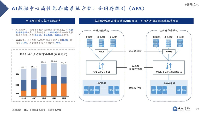 全闪存阵列性能优势突出,已成为高性能数据中心的必然趋势。AI数据中心、云计算等新兴技术领域的不断发展,对高性能存储系统提出了更高的需求。随着SDD替代HDD的进程,SDD低延迟、高吞吐与传统SCSI协议低吞吐、高延迟形成矛盾,这就出现了NVMe高速协议。NVMe高速协议缩短和优化了数据路径,加快了服务器内、服务器与存储阵列间的信息传输,配合SSD高速介质,突显了全闪存阵列的性能优势。2020年,全闪存阵列(AFA)市场占比已达到18.9%,增速为24.0%,高于整体市场平均增长率17.5%。