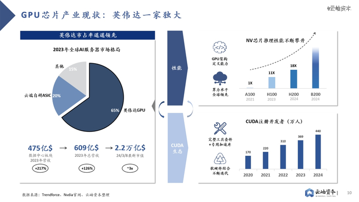 GPU芯片英伟达一家独大,高性能硬件+CUDA生态强强绑定,软硬件结合构建行业壁垒。2023年英伟达在全球AI服务器市场占有率达到65%,在全球GPU芯片领域更是保持*的龙头地位,市占率达到80%以上。2023年英伟达数据中心板块营收达475亿美金,同比增长217%,最新市值已达到2.2万亿美金。英伟达稳固的龙头地位来自于软硬件结合形成的生态壁垒,硬件层面算力水平全球*的同时搭配软件平台CUDA,为客户带来1+1>2的大模型训推成效。