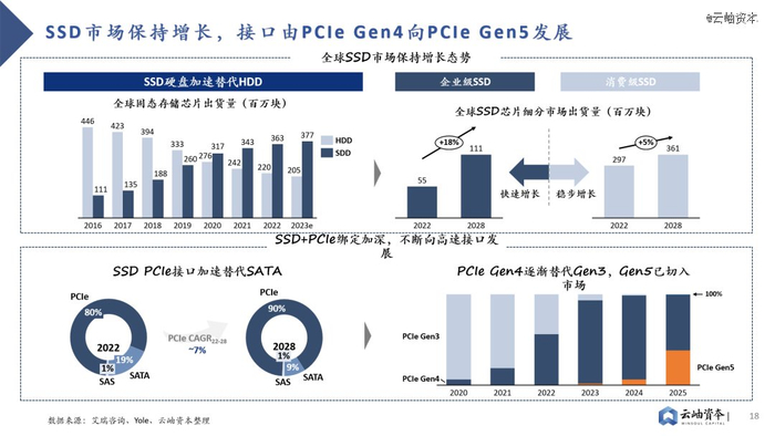全球SSD市场保持增长态势,传输带宽不断增加,PCIe Gen4已逐步转向PCIe Gen5。2022年全球SSD出货量为3.63亿块,保持增长态势的同时加速替代HDD。细分市场中企业级SSD市场仍处于快速增长通道,2022年出货量为0.55亿块,2022-2028年CAGR达18%。消费级SSD市场追随企业级市场脚步保持稳步增长,2022年出货量为2.97亿块,2022-2028年CAGR达5%。高速串行接口PCIe与SSD绑定加深,逐渐替代SATA成为主流接口,并不断向更高速协议发展。PCIe Gen4已替代PCIe Gen 3成为主流接口,PCIe Gen5已切入市场,成为未来发展趋势。