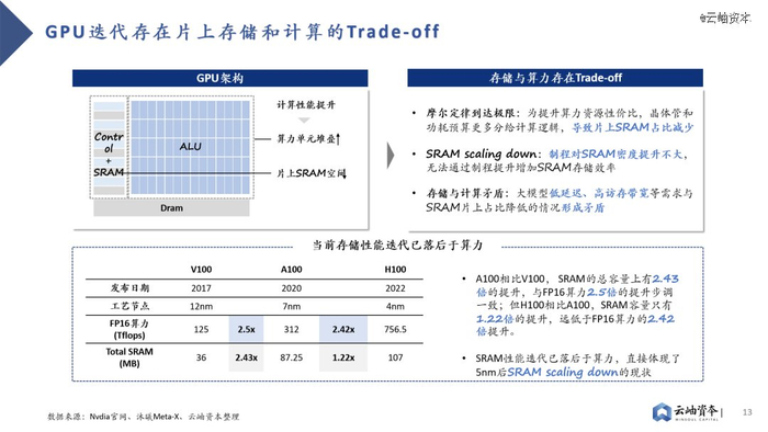 GPU迭代存在存储与计算的Trade-off,存储性能迭代已落后于算力迭代。GPU架构存在算力单元“小”而“多”的特点,在摩尔定律接近极限的情况下,为提升算力资源性价比,业界主要通过增加算力单元堆叠的方式提升计算性能;而在存储方面,片上存储空间被挤压的同时,SRAM密度却无法通过制程提升进行弥补,导致当前存储性能迭代已落后于算力。H100相对于A100在FP16算力水平上有2.42倍的提升,而SRAM存储容量提升仅有1.22倍。