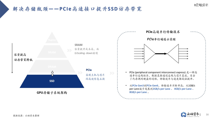 其二则是PCIe技术的持续升级。目前SSD接口已从SATA逐步转向更高速的PCIe接口,这是一种高速串行总线标准,数据直接通过总线与芯片直连,省去了内存调用硬盘的过程,传输效率与速度都成倍提升。从PCIe Gen3到PCIe Gen6,传输速率不断升高,从1GB/s per Lane逐步发展到2GB/s per Lane 、 4GB/s per Lane 、 8GB/s per Lane 。