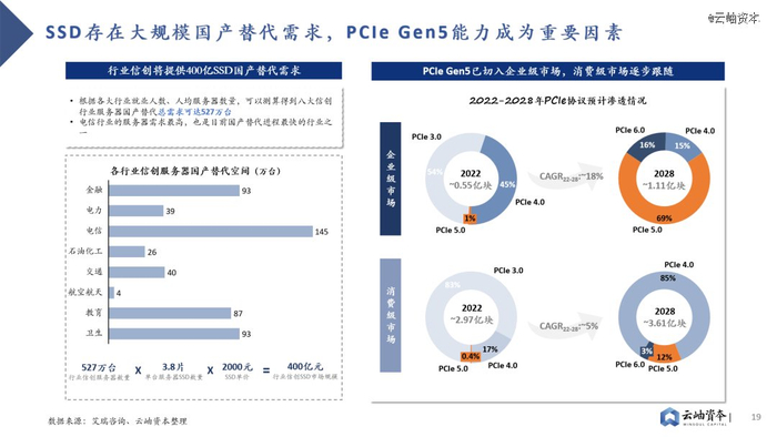 此外,信创市场将提供400亿元SSD国产替代需求,PCIe Gen5能力成为重要考量因素。金融、电信、教育等八大行业存在信创服务器国产替代需求,总需求可达527万台。以单台服务器SSD数量3.8片、SSD单价2000元计算,行业信创将带来400亿元SSD市场规模。其中电信行业服务器需求最高,也是国产替代进程最快的行业之一,对于SSD高容量、高带宽存在高要求。目前PCIe Gen5已加速切入企业级SSD市场,预计2028年渗透率将达69%。消费级市场也将追随企业级市场步伐,预计2028年PCIe Gen5渗透率达12%。