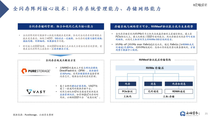 1)相较于HDD,SSD存在闪存的有限写操作周期、损耗均衡、纠错编码、坏数据块等问题,传统SSD控制器已无法满足全闪存系统管理需求,如何进行全闪存存储的管理、组合、优化成为核心技术要求,国际龙头PureStorage、VAST Data均通过自研软件技术方案以增强全闪存系统管理。