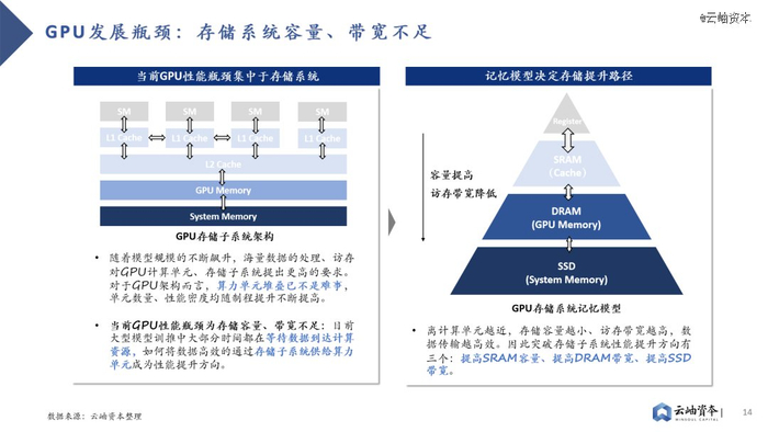 GPU主要采用多级Cache的分布式存储子系统,离计算单元越近的存储单元容量越小,访存带宽越高,因此性能提升方向有三:提高SRAM容量、提高DRAM带宽、提高SSD带宽。其中片上SRAM容量提升成本高,并非主流路径。