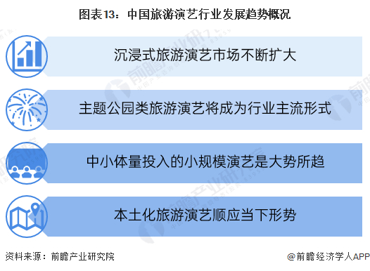 旅游演艺逐步从单一的歌舞模式逐渐向身临其境的沉浸式互动体验方向转变,观众从原来简单的场外观看到进入场内与演员进行互动。其次,主题公园类旅游演艺节目均在主题公园内演出,游客在游玩项目的休息间歇也可欣赏演艺节目,两者相互融合,共同吸引游客前往。国内旅游演艺行业在市场需求加速迭代、疫情常态化持续冲击等多重压力下,中小投资体量、高效人均产出、深度沉浸式体验等是未来发展方向。由于疫情冲击,周边旅游,本土旅游的特点更加突出,本土化的旅游演艺是顺应当下疫情常态。。