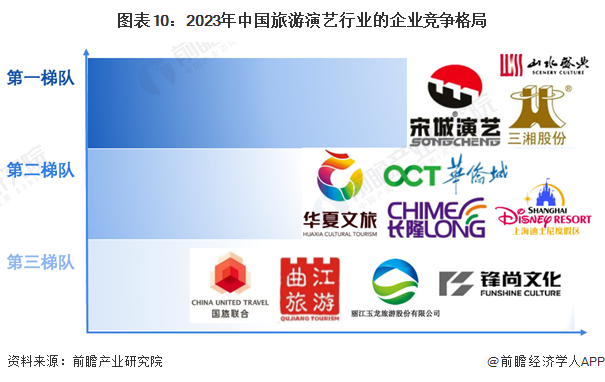 经过多年激烈的市场竞争,中国旅游演艺行业的竞争格局逐渐呈现明显的梯队差异,具体分为两个梯队。第一梯队为宋城演艺、山水盛典和三湘印象;第二梯队以华夏文旅集团、华侨城集团、长隆集团还有迪士尼为代表。第三梯队是以国旅联合、曲江文旅、丽江玉龙旅游股份、尚峰传媒等为代表。