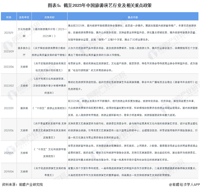 为推动投资拉动型的经济增长模式向消费主导的经济增长模式转型,政府出台多项政策,引导包括休闲旅游和演艺在内的旅游行业发展。《“十四五”文化和旅游市场发展规划》中提出打造一批具有示范价值和社会效应的旅游演艺项目;《关于实施旅游促进各民族交往交流交融计划的意见》提出推动民族地区旅游演艺、文化遗产旅游、医药资源、特色节庆展会等传统商业综合体转型升级。总体上看,中国旅游演艺行业相关法律及行政法规的制定推动旅游演艺行业不断蓬勃发展。