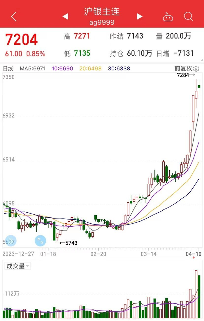 国内方面,沪银期货主力合约3月初价格为5850元/千克,而4月9日盘中最高涨至7284元/千克,历史新高不断被刷新。期货价格飞升也带动了现货白银价格上涨。根据融通金实时报价,截至发稿,国内白银的销售价格已经突破6.88元/克,直逼7元大关。