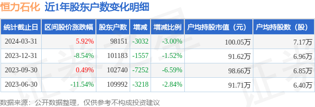 从股价来看,2023年12月31日至2024年3月31日,恒力石化区间涨幅为5.92%,在此期间股东户数减少3032.0户,减幅为3.0%。