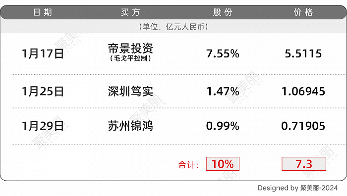 最终,在今年1月17日、1月25日、1月29日,毛戈平夫妇控制的帝景投资、深圳笃实以及苏州锦鸿分别花费5.5115亿、1.06945亿、7190.5万合计7.3亿,买回了九鼎所持有的10%(三者分别买回股份7.55%、1.47%、0.99%)的股份。自此九鼎不再持有毛戈平公司的任何权益,毛戈平“拆弹”成功。