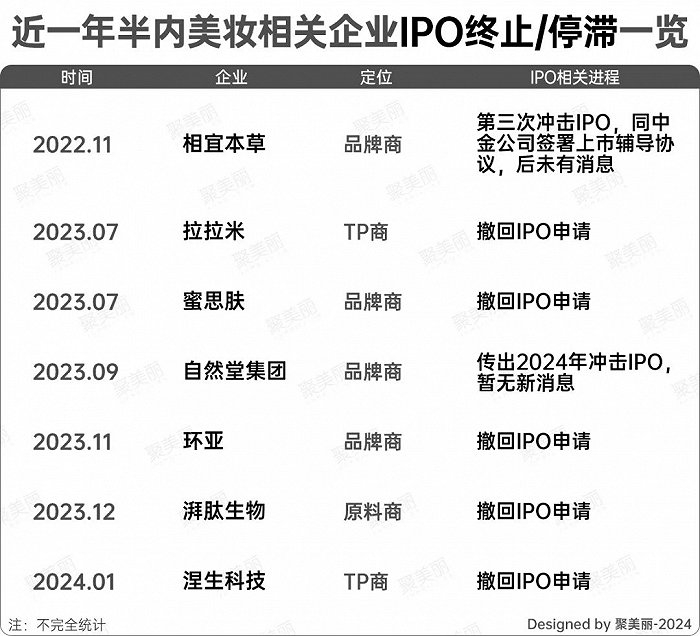 据不完全统计,自2023年至今,有十余家美妆相关企业都终止了IPO申请,这其中既包括了环亚、蜜思肤这类品牌方,也有拉拉米、涅生科技等TP商,以及原料商湃肽生物,整个产业链都面临IPO难现状。