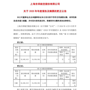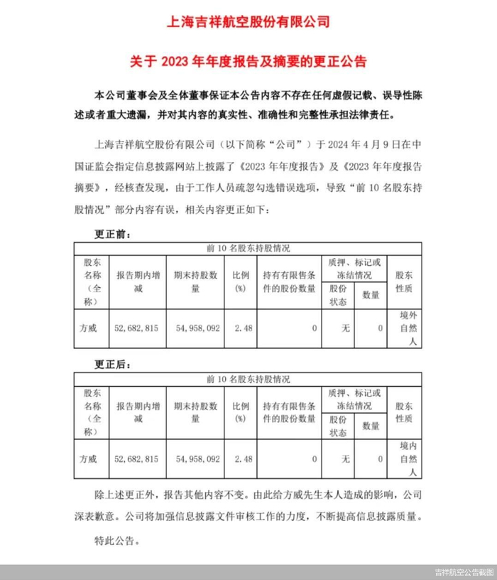 随后,吉祥航空在同日发布公告解释称,该错误系工作人员疏忽勾选错误选项,并在公告中将方威的股东性质更正为“境内自然人”,同时向方威致歉。