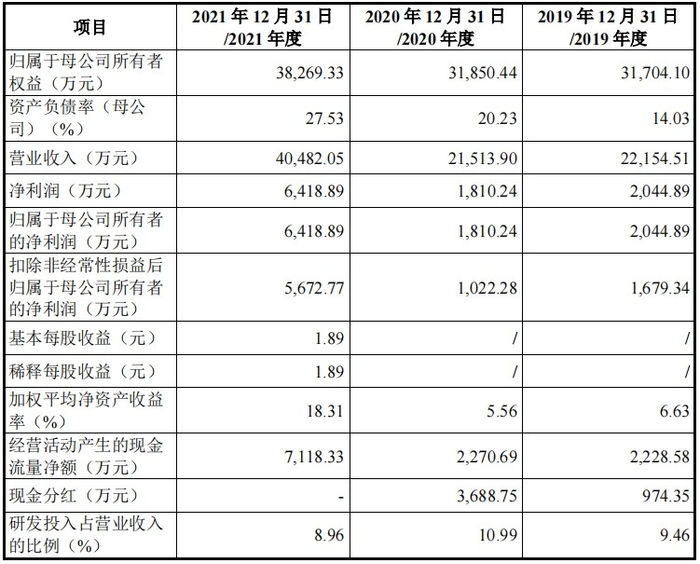 财务方面,于2019年、2020年、2021年,公司实现营业收入分别约为2.22亿元、2.15亿元、4.05亿元;同期,公司实现净利润分别为2044.89万元、1810.24万元、6418.89万元。