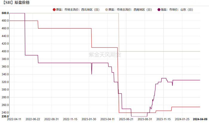 原盐价格稳定。山东海盐价格325元/吨。西北原盐255元/吨;西南原盐400元/吨。持平上周。