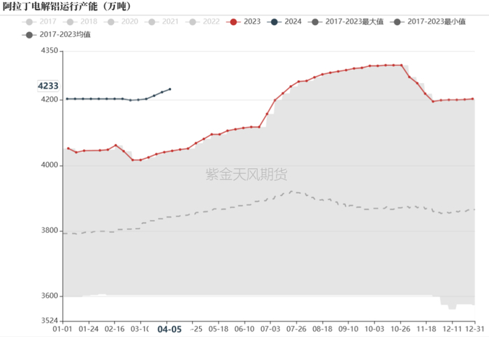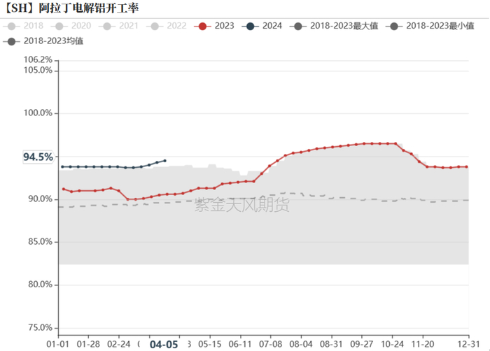 电解铝运行产能微增。电解铝建成产能4481.1万吨,运行产能4233.4万吨,开工率94.45%(+0.2%)。