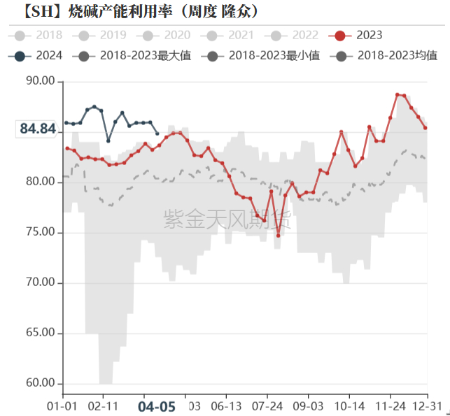 烧碱开工降低。整体开工率84.84%,环比降1.11个百分点。