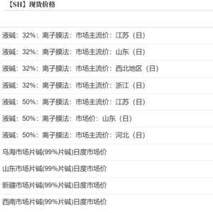 烧碱现货价格下滑。32碱山东主流价730(周度降50),折百2281。50碱山东主流价1270(-70),折百后折盘面2460。内蒙片碱出厂价2850,周内先降,今日涨回。