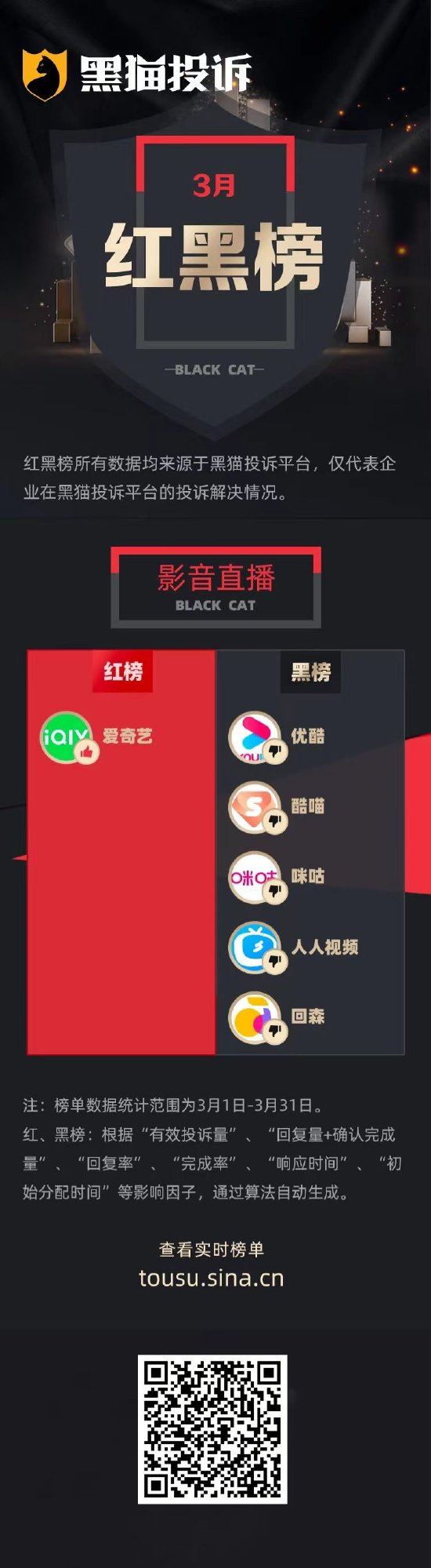 3月黑猫投诉影音直播领域红黑榜:优酷会员自动续费一年无明显提示