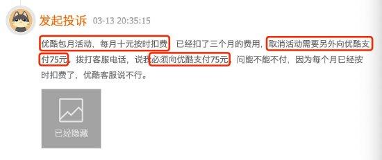 本月中,大量消费者称遇到优酷会员自动续费的问题。有消费者反馈家里老人办理优酷会员被自动续费了一年而无明显提示。还有消费者称自己参与优酷包月活动,在每月10元被按时扣费的情况下,取消活动还必须另外向优酷支付75元。截至3月底,优酷累计投诉15044单,回复率不足1%。