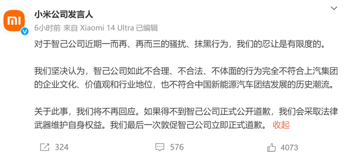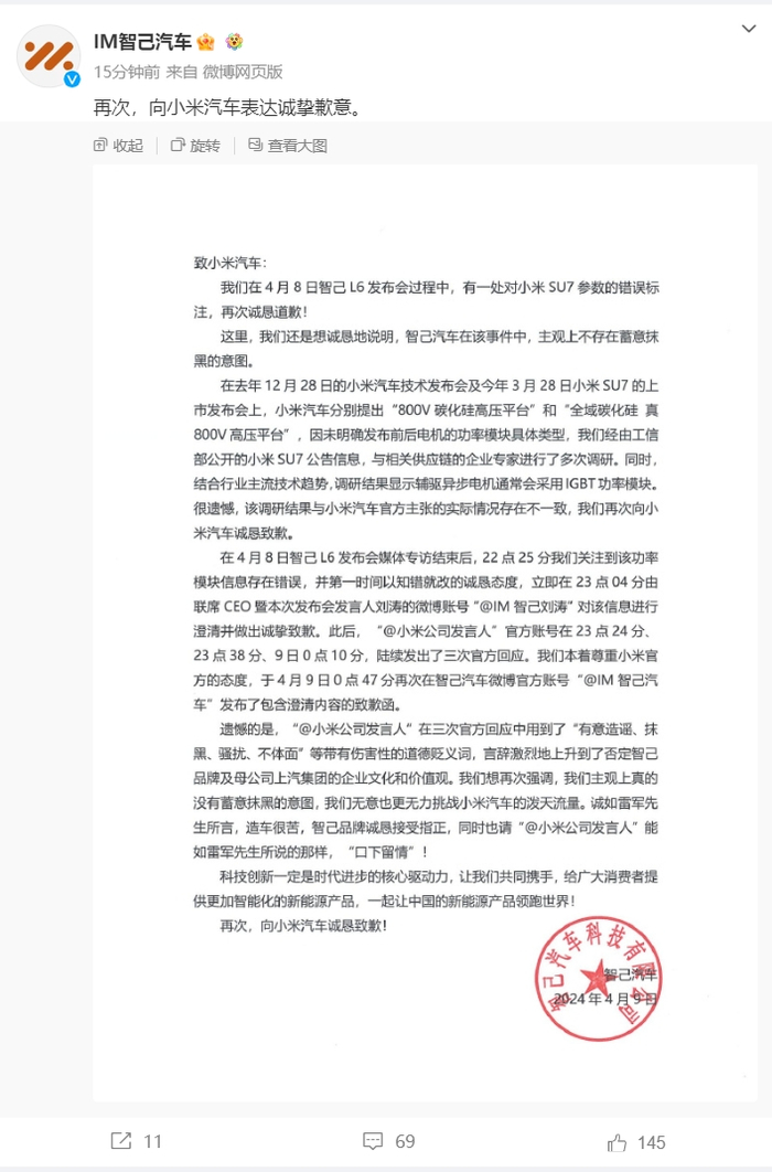 4月9日16时11分,智己汽车在官方微博发文,再次向小米汽车致歉。