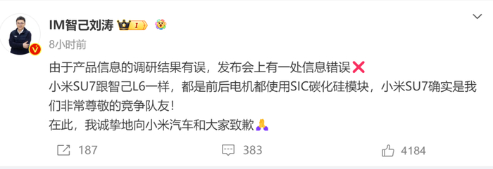 小米SU7 Max版前后电机均采用SIC碳化硅模块,与智己L6所采用的技术一致,均为行业顶尖的技术标准。小米汽车及旗下产品SU7,是我们尊敬的竞争队友!由于内审出现疏漏,造成对小米汽车的负面影响,我们深表歉意,也向所有粉丝、用户们诚挚致歉!